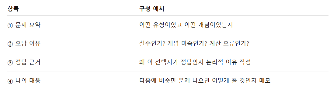 - 틀린 개념은 표로 정리 + 개념사전 만들기