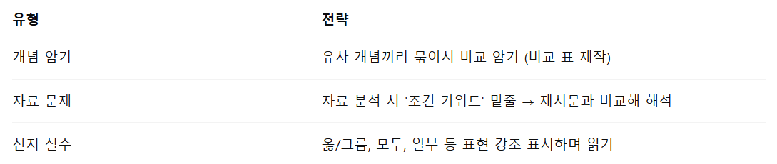 - 사회문화: 통계 자료를 활용한 문제 다수 등장. 개념 간 혼동 유도 문제 출제.