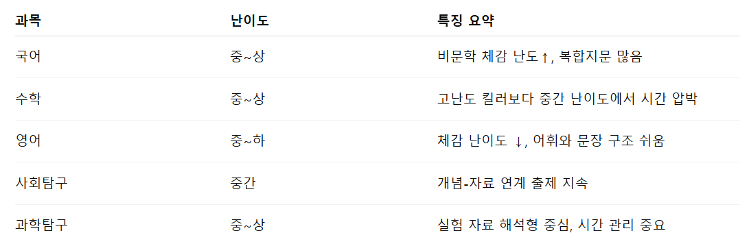 - 문제 구성: 킬러 문항보다는 고난도 비문학에서 체감 난이도 상승.