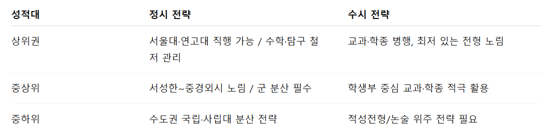 - 수학·국어 고득점 조합 중요: 이공계는 수학, 인문계는 국어 비중↑