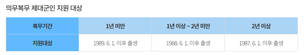 군 의무복무를 마치고 사회에 진출하는 청년들의 특수성을 고려하여, 의무복무 제대 청년에게는 다음과 같은 별도 기준이 적용됩니다.
