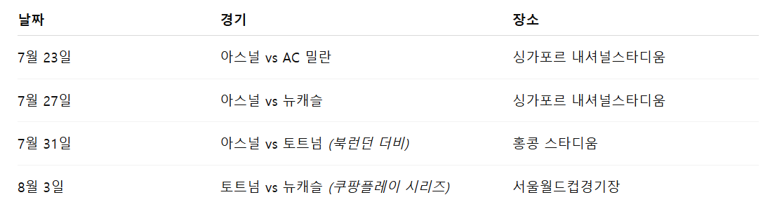 특히 북런던 더비(홍콩)와 쿠팡 시리즈(서울), 그리고 싱가포르 인터내셔널 챔피언스컵은 아시아 축구 팬들에겐 절호의 기회! 티켓 예매 방법과 일정, 가격 정보까지 정리해드릴게요.